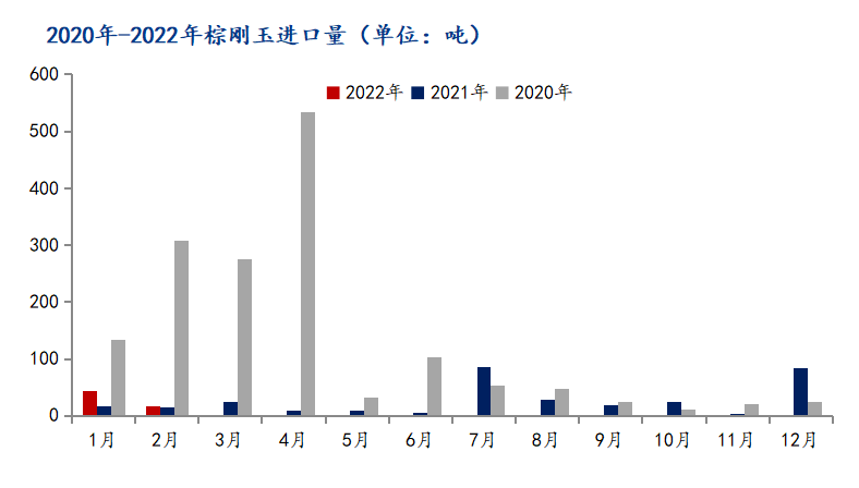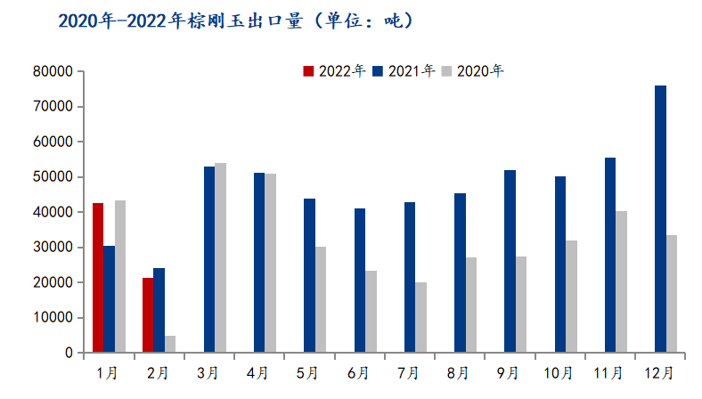 据海关数据显示,2022年1月和2月棕刚玉进口量分别为44.164吨和16.424吨,从年同比来看,1月和2月棕刚玉进口量年同比分别提升174.63%和3.08%;从月环比来看,2月进口量环比1月下降62.81%。2022年1-2月棕刚玉累计进口量为60.588吨,累计同比增加89.25%。