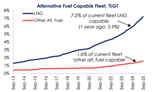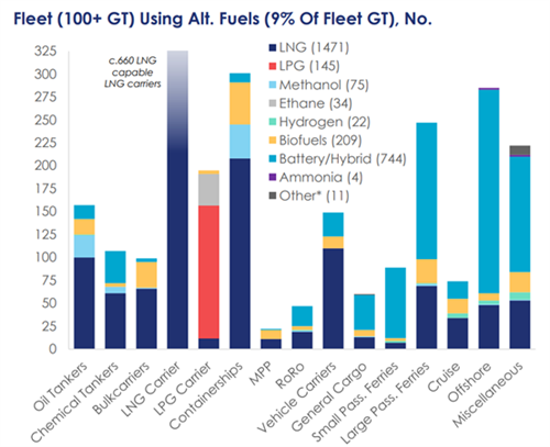 根据克拉克森的数据,整体而言按吨位计算,截至目前在运营船队中能够使用替代燃料或推进装置船舶的比例已经提高到了8.8%,高于2017年的2.6%和2024年年初的6.5%。在现有总计2557艘替代燃料船舶中,包括1471艘LNG动力船、75艘甲醇动力船、145艘LPG动力船、744艘电池/混合动力推进船,此外还有279艘采用其他燃料。