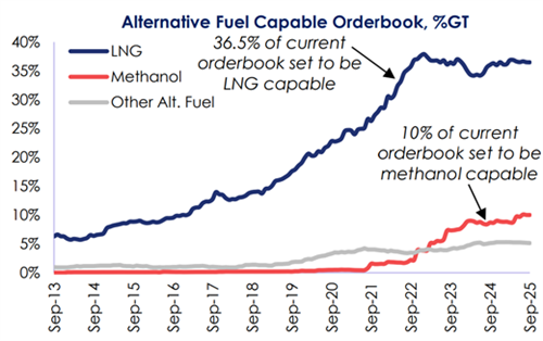 而在手持订单中,替代燃料船舶占比更是达到了51.7%,高于2017年的10.9%和2024年初的48.6%。按吨位计算,手持订单中36.5%为LNG动力船(1000艘),10.0%为甲醇动力船(329艘),2.0%为LPG动力船(139艘);此外还有约3.2%(约553艘)使用其他替代燃料,其中包括36艘氢燃料、62艘乙烷燃料、47艘氨燃料、18艘生物燃料和515艘电池/混合动力推进船舶,替代燃料船舶手持订单总计2021艘。