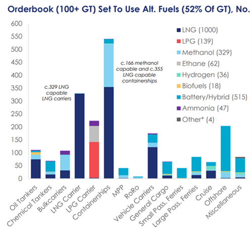 今年的替代燃料船舶订单包括LNG动力船141艘1920万总吨,甲醇动力船53艘610万总吨,LPG动力船14艘60万总吨,乙烷动力船4艘10万总吨,以及电池/混合动力推进船舶93艘130万总吨。